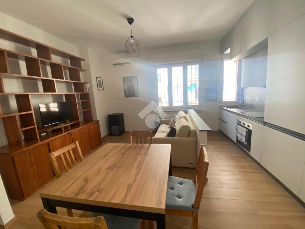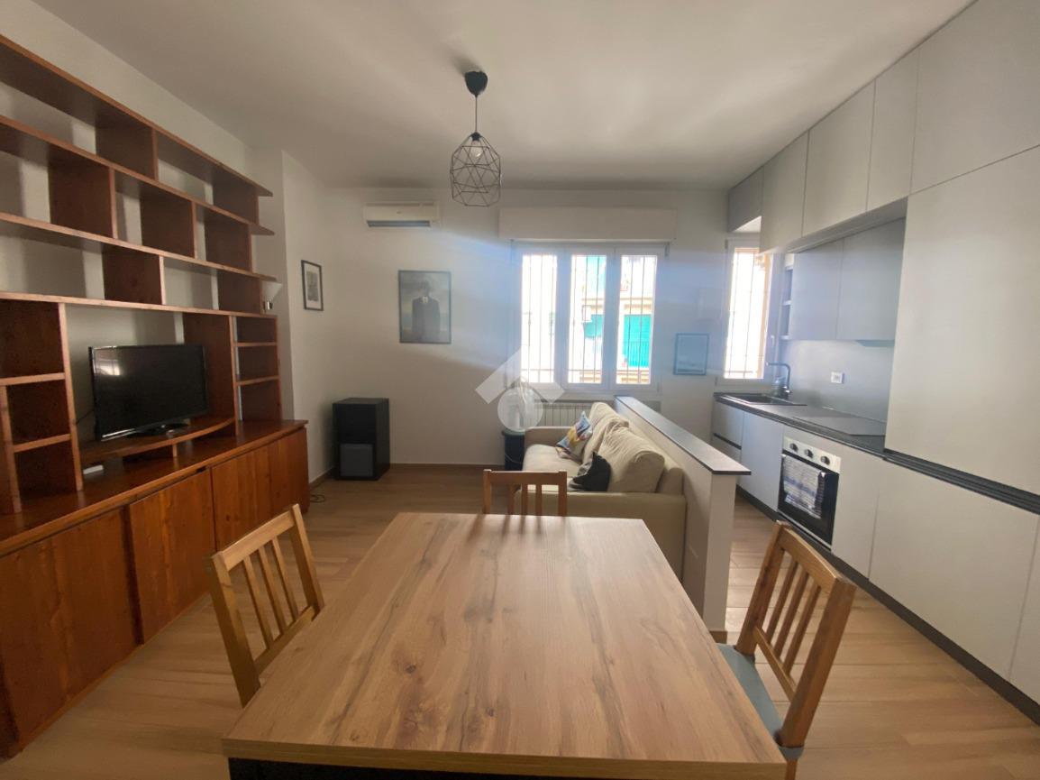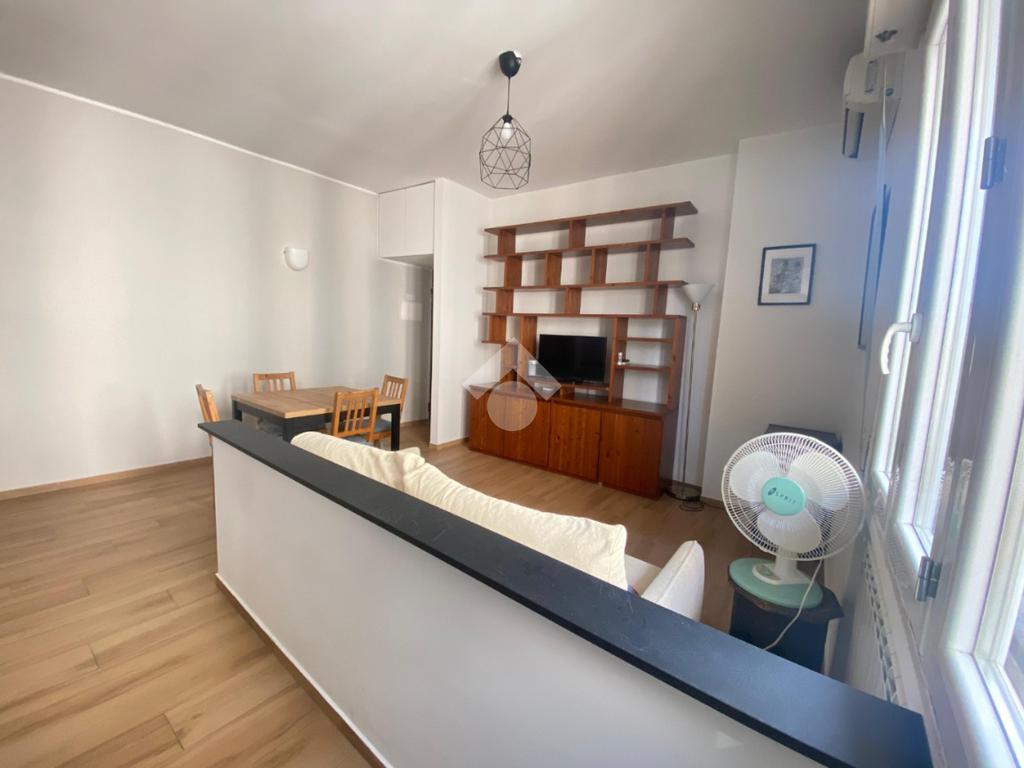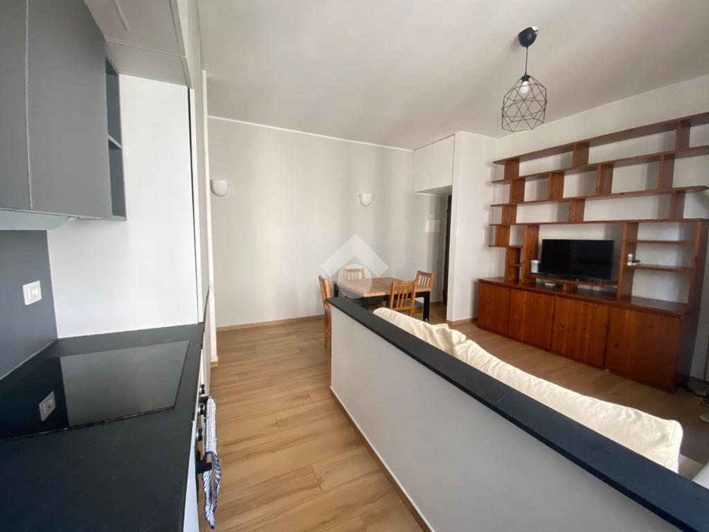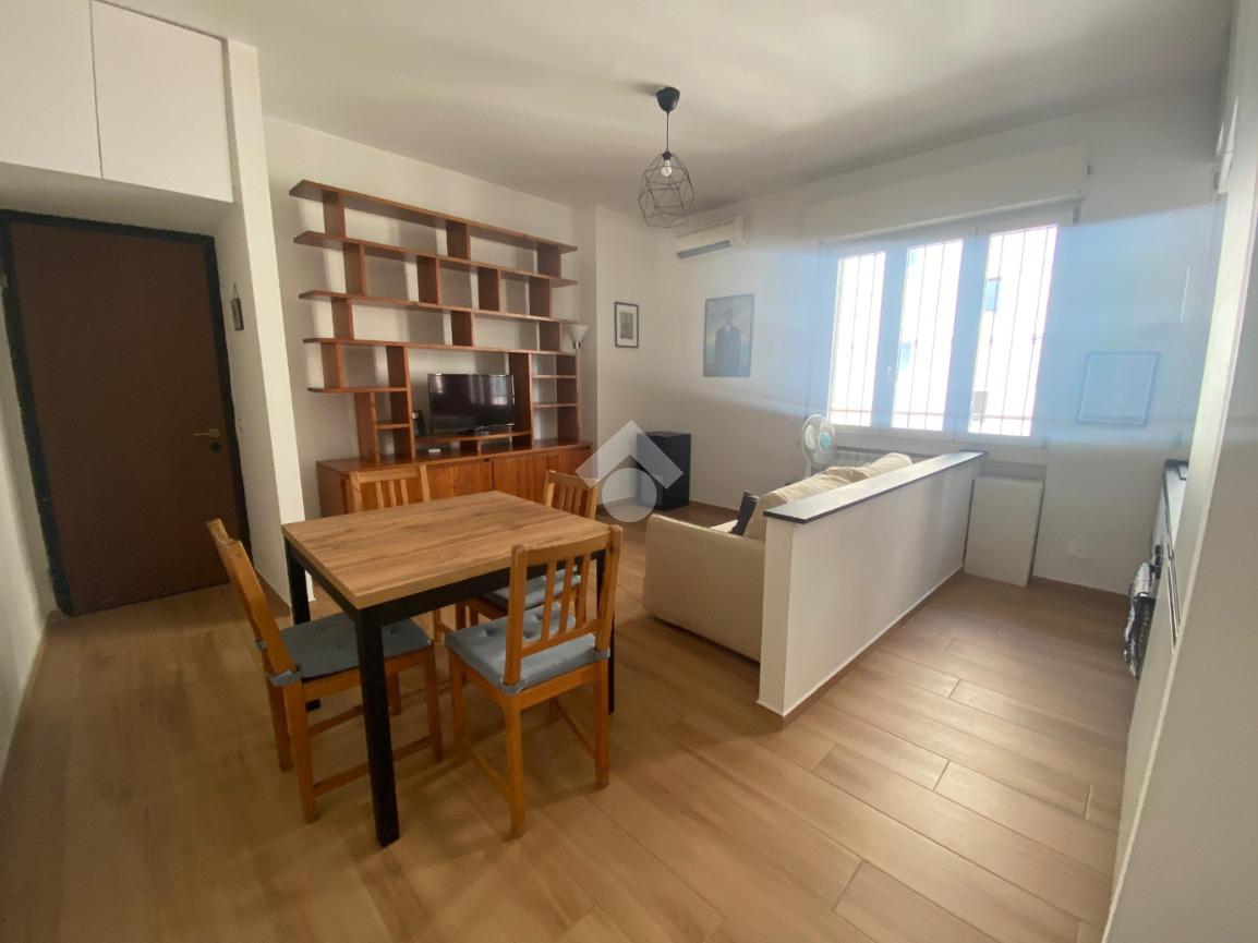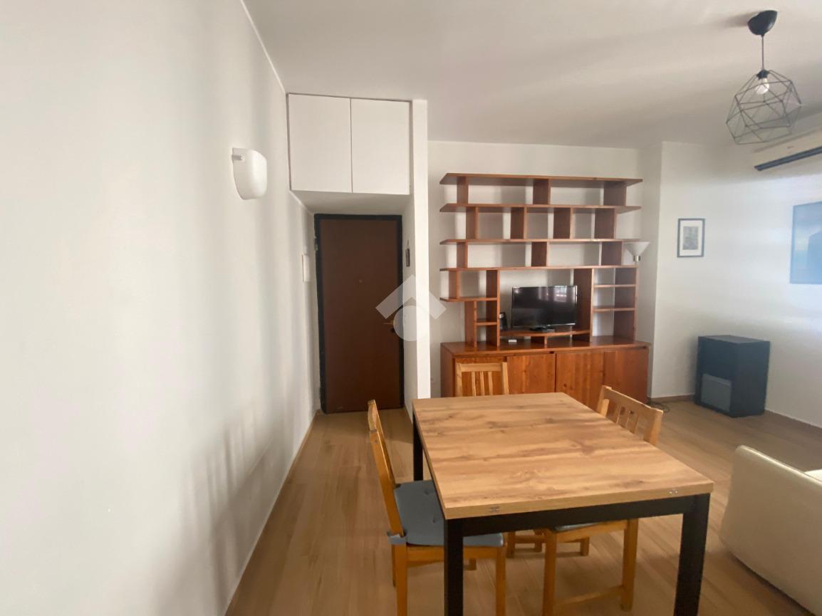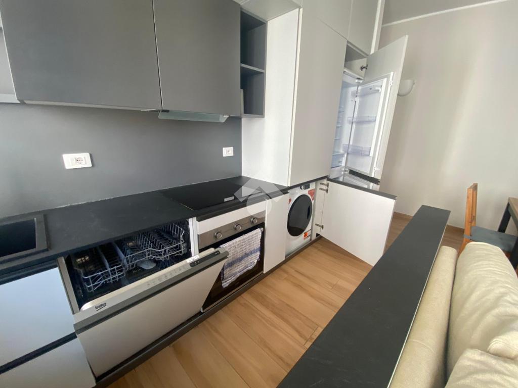 L’appartamento si apre su un luminoso soggiorno con cucina a vista, completamente attrezzata e dotata di lavastoviglie e una pratica lavatrice/asciugatrice.