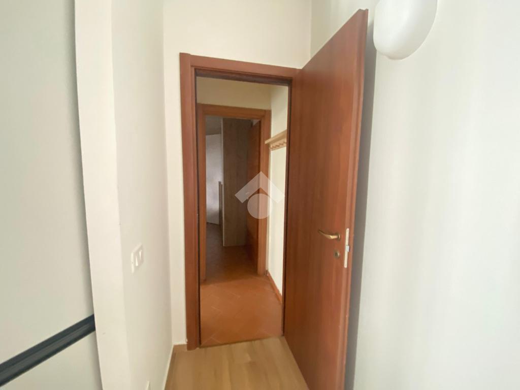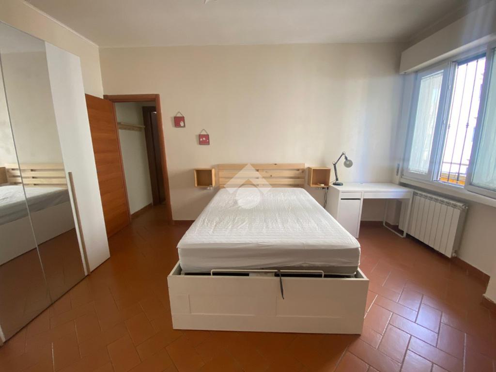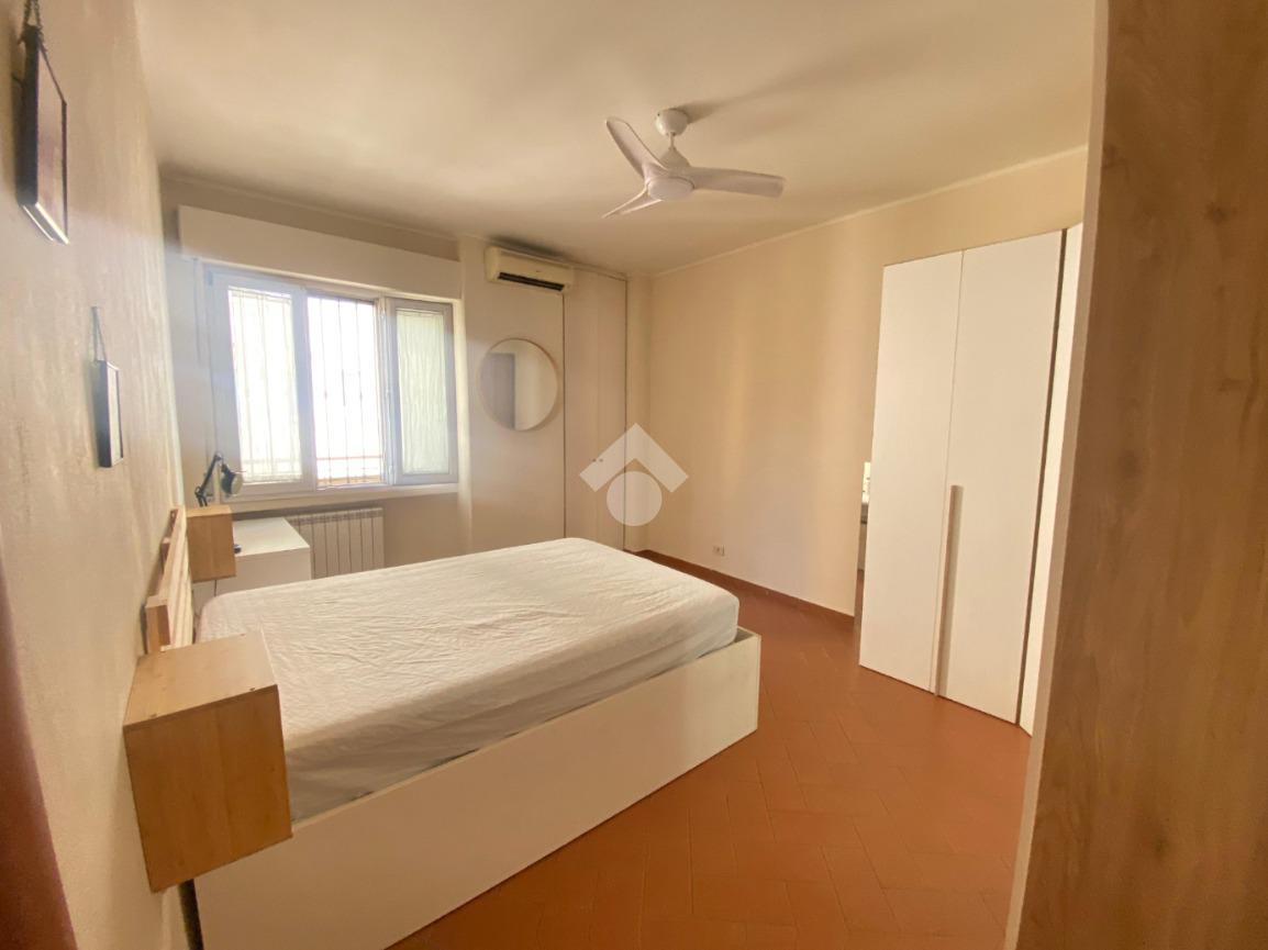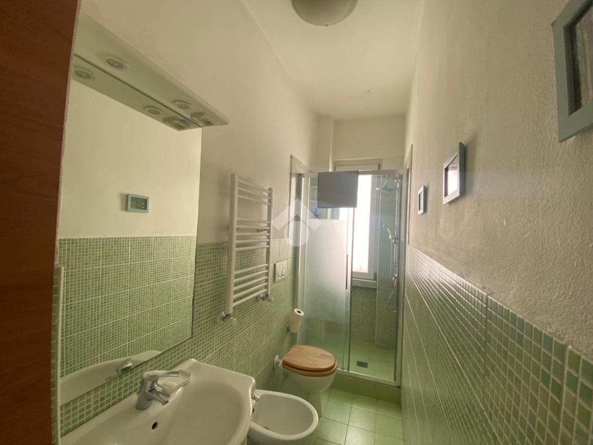 Dal disimpegno si accede al bagno finestrato con box doccia e alla camera da letto matrimoniale, ampia e confortevole.