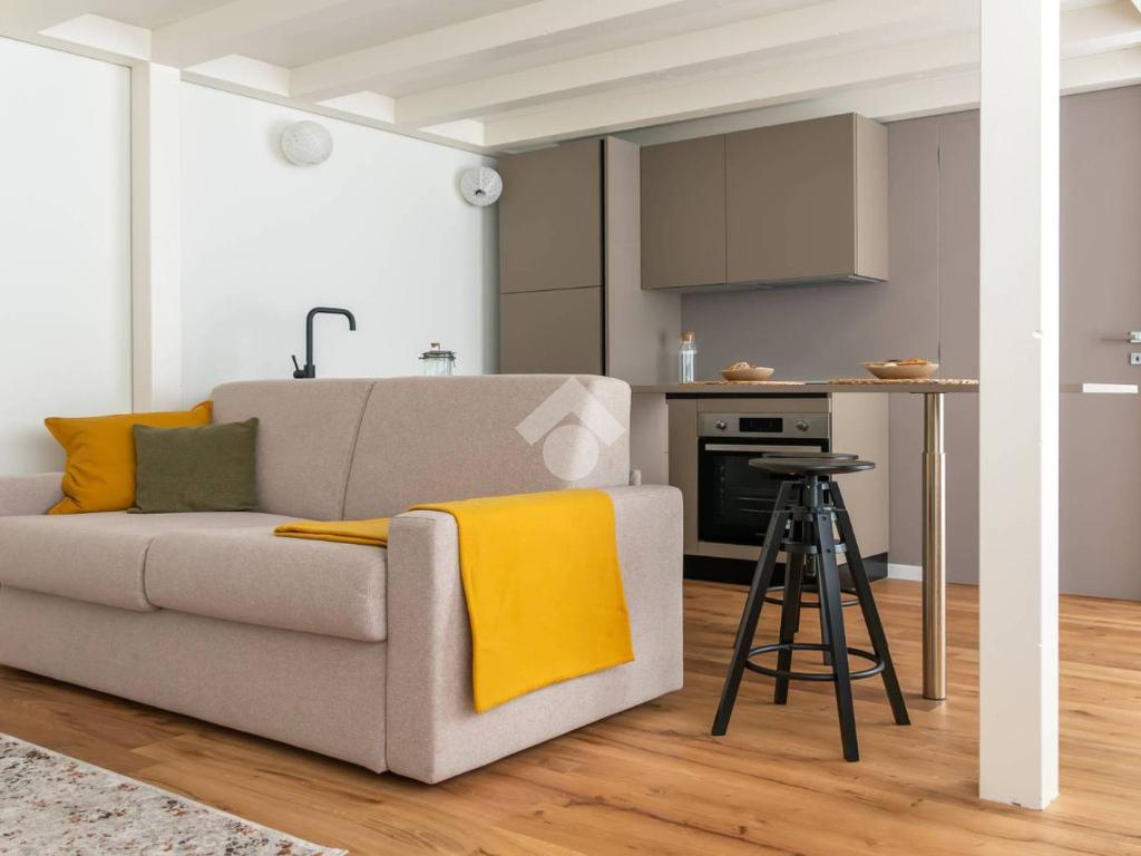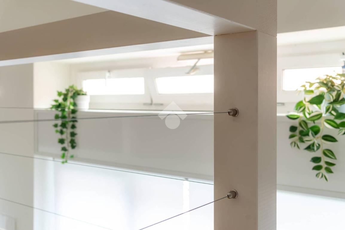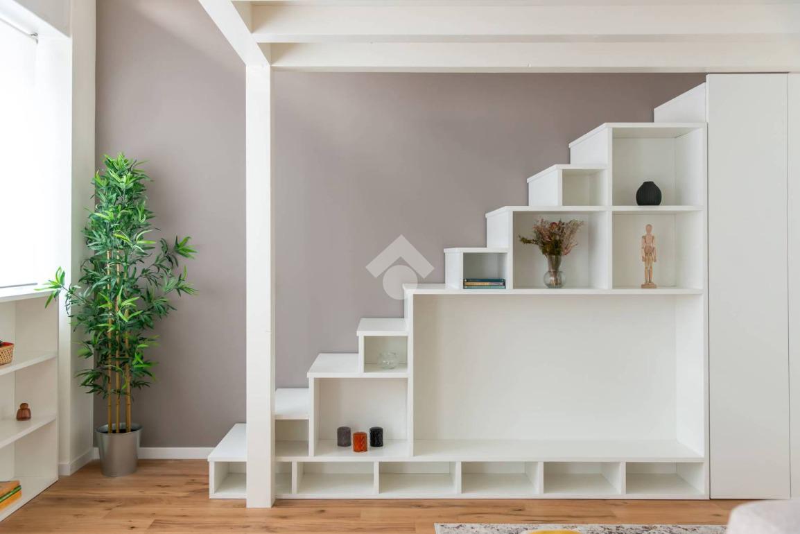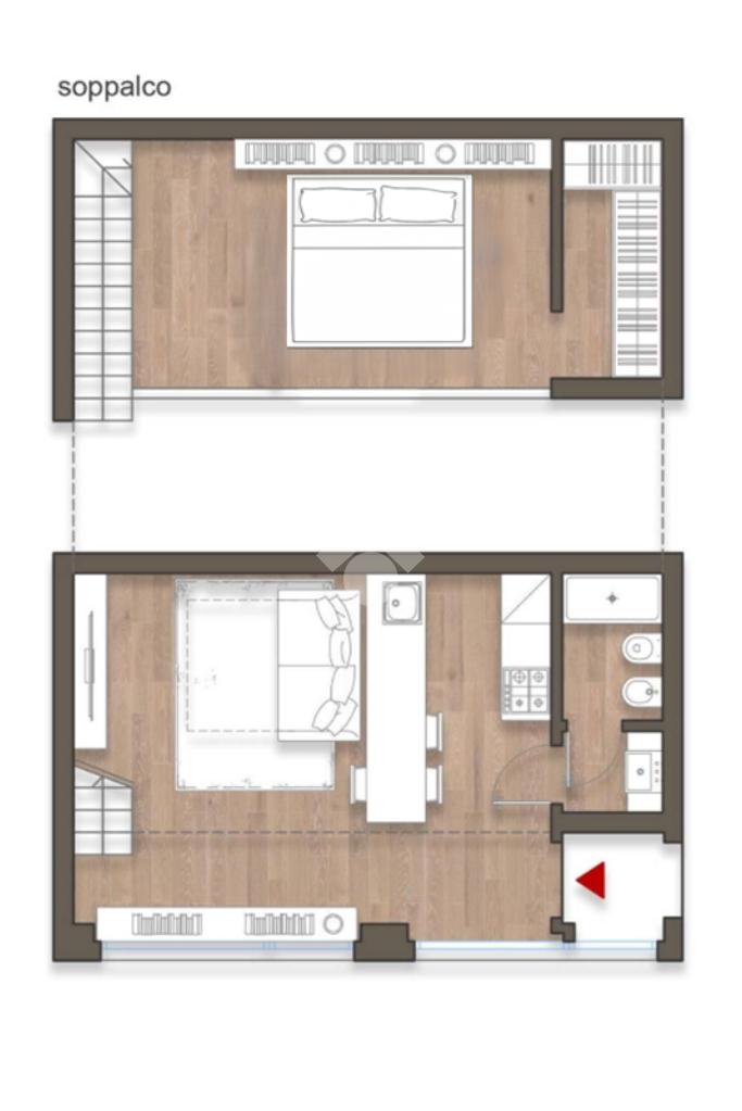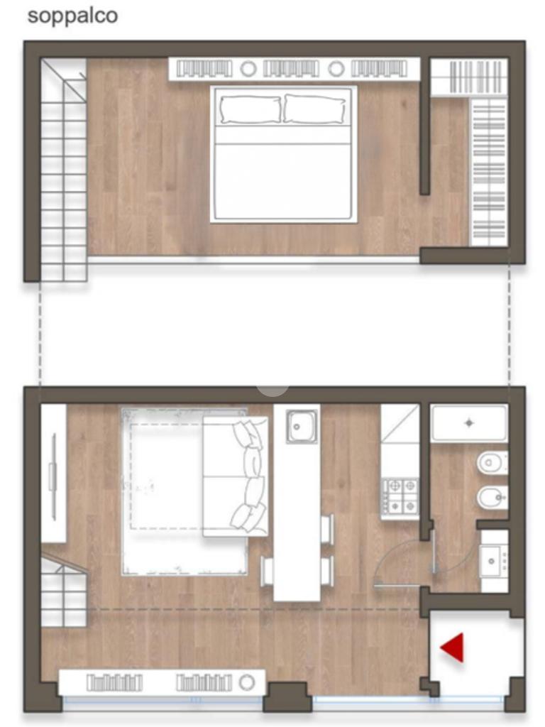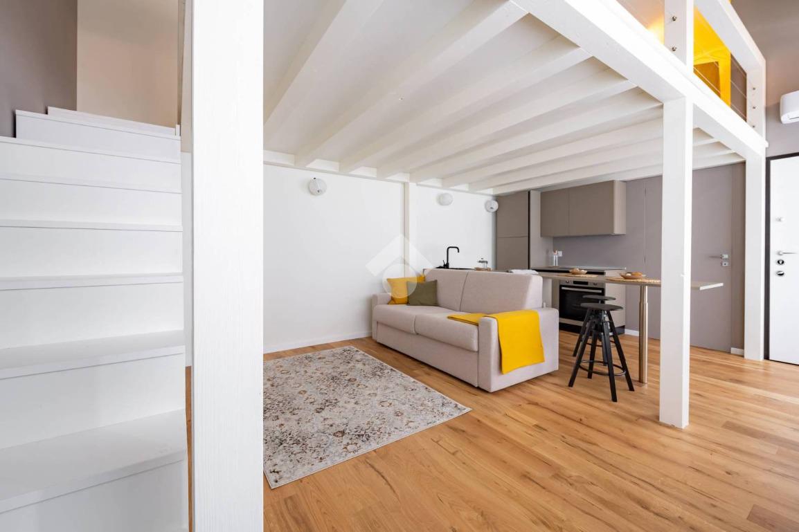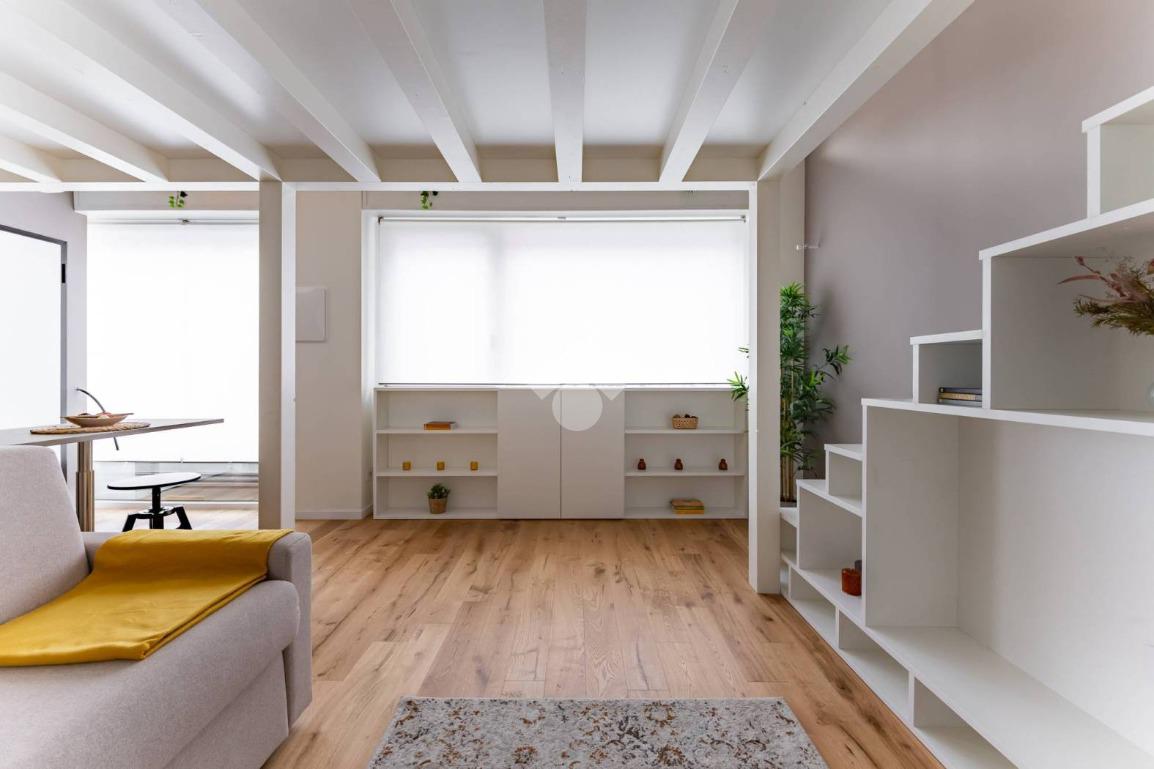L’ingresso si apre su una luminosa zona giorno open space, illuminata da un’ampia vetrata, a cui si affianca una cucina semi-abitabile, moderna e completamente attrezzata. Il bagno è dotato di una doccia, mentre il soppalco ospita una pratica cabina armadio.