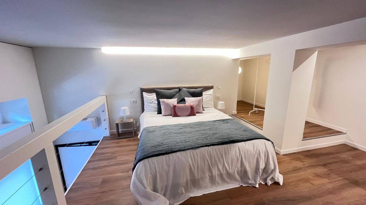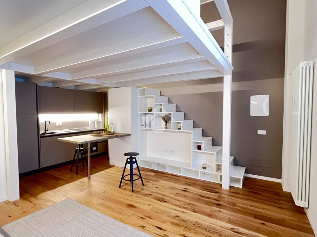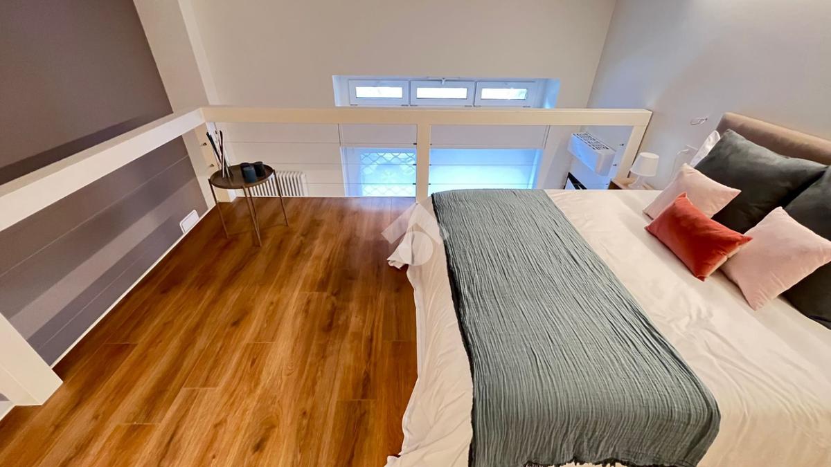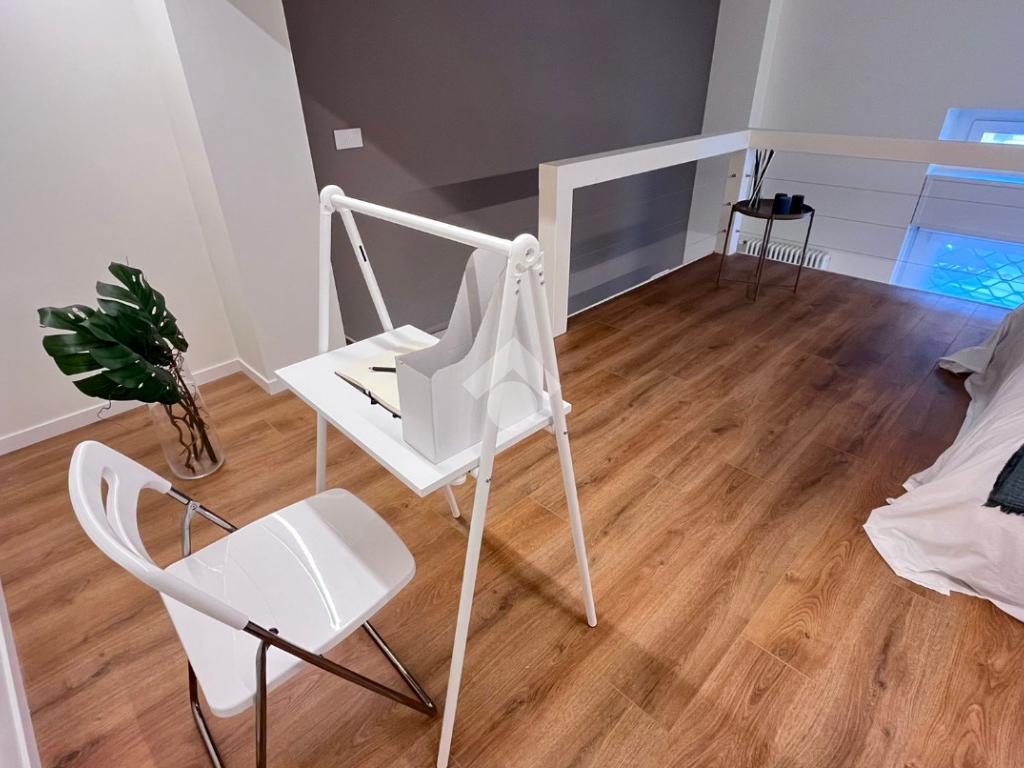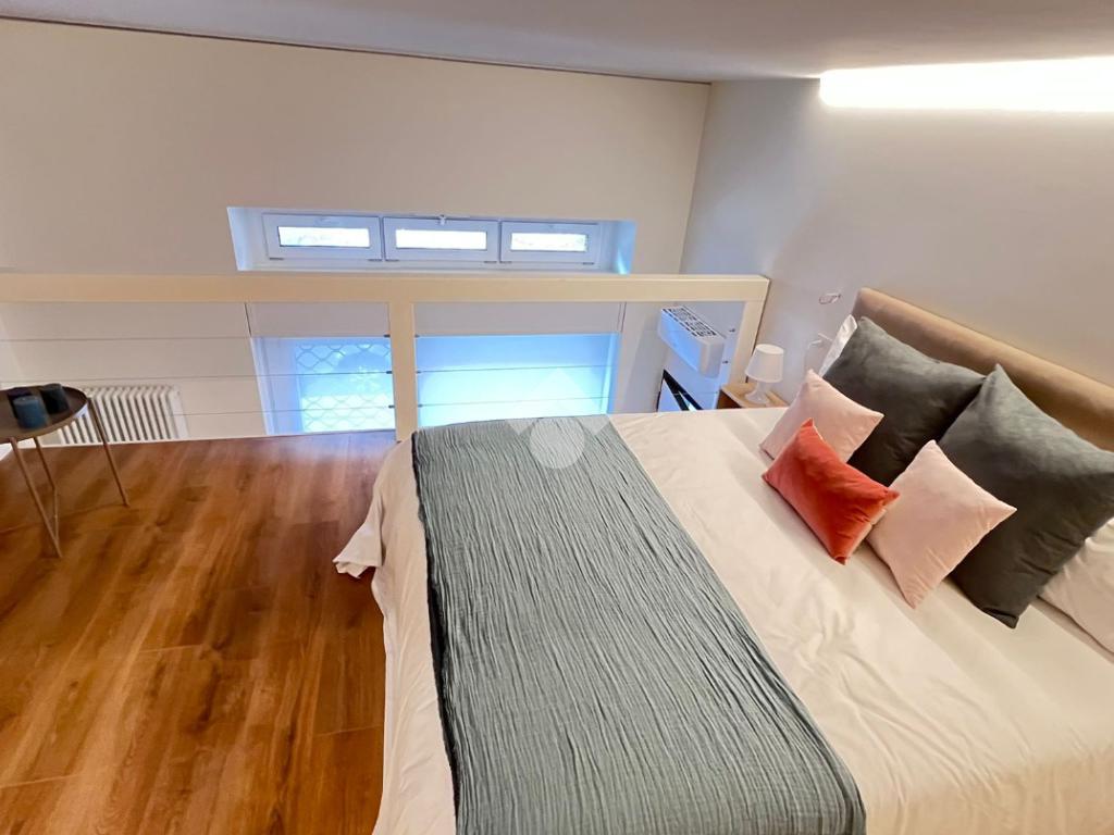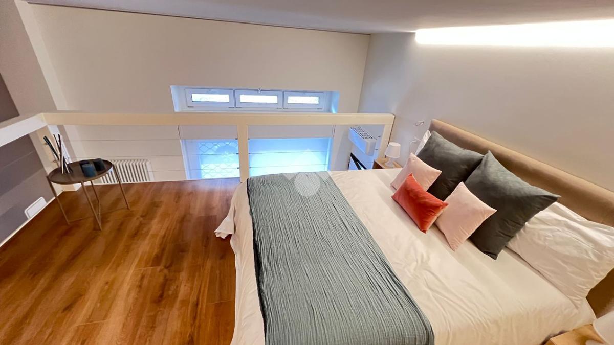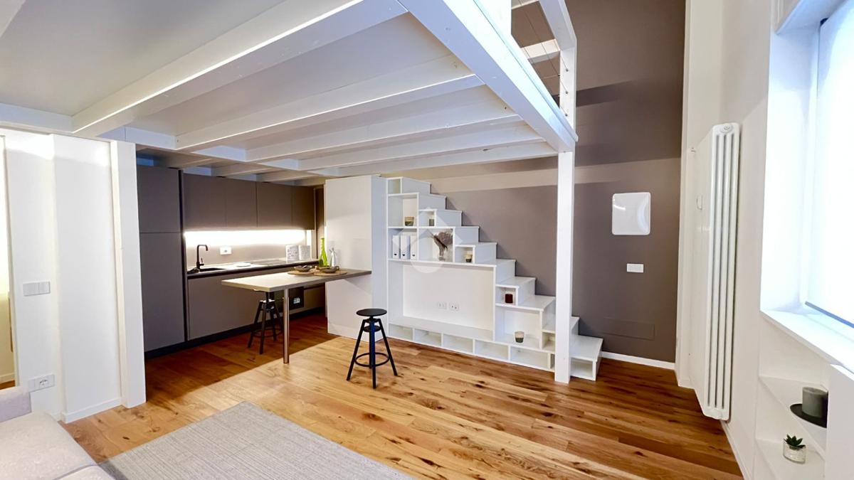 L’ingresso si apre su una luminosa zona giorno open space, illuminata da un’ampia vetrata, a cui si affianca una cucina semi-abitabile, moderna e completamente attrezzata. Il bagno è dotato di una doccia, mentre il soppalco ospita una pratica cabina armadio.