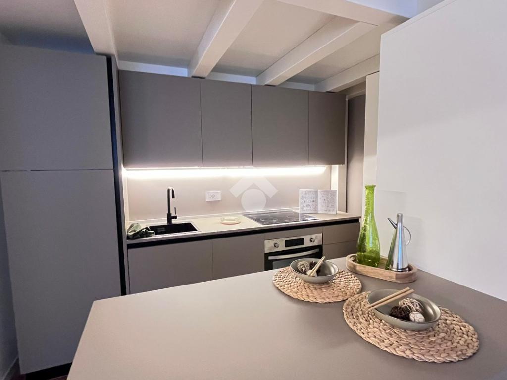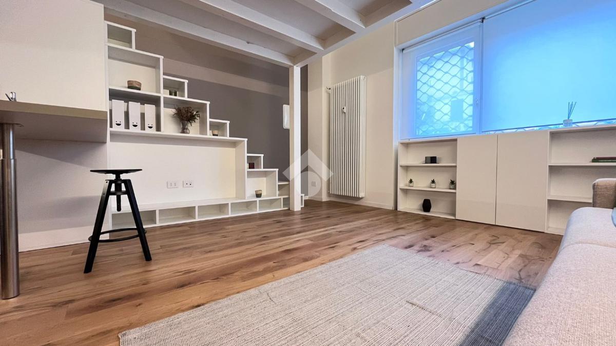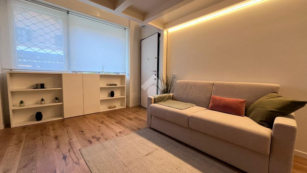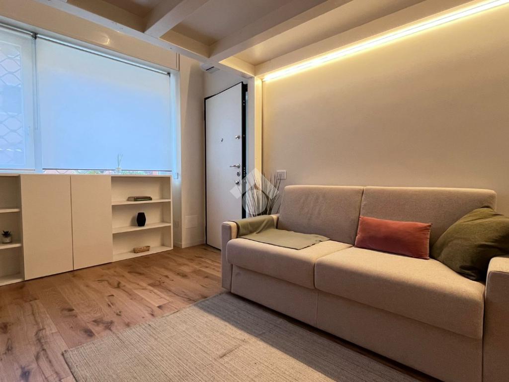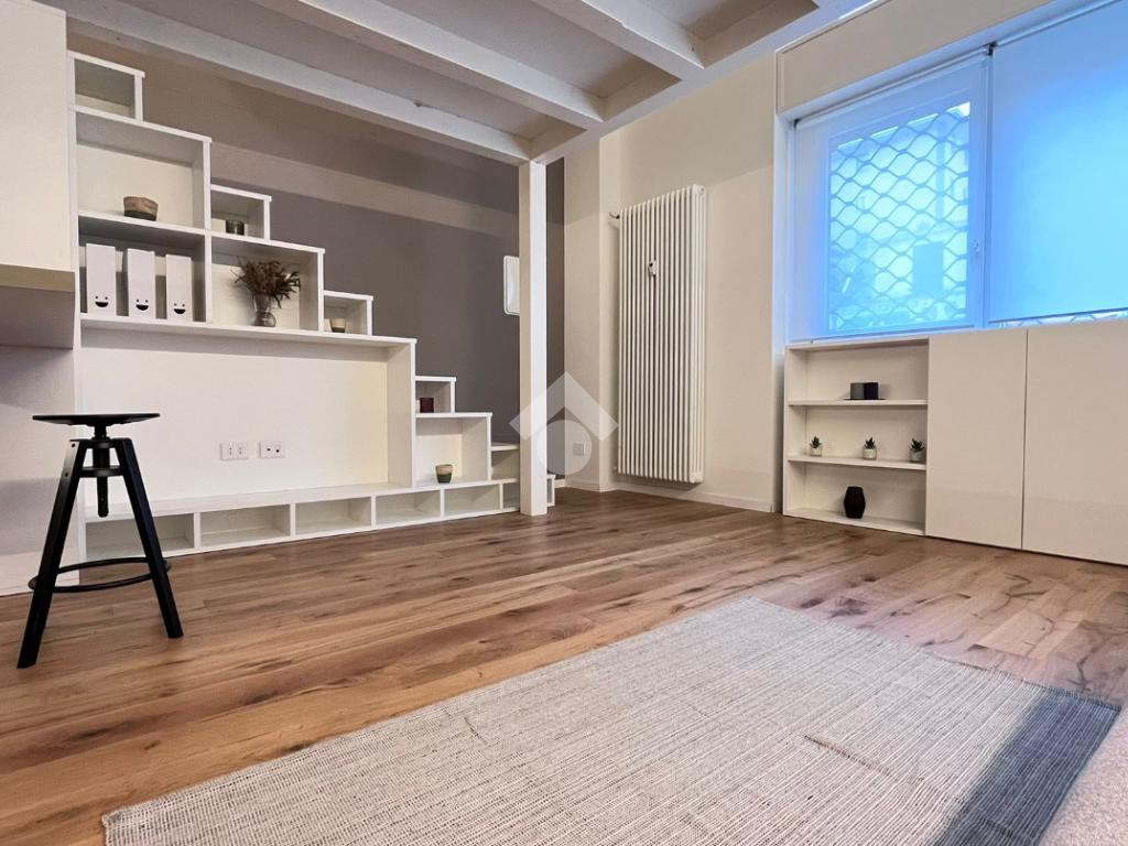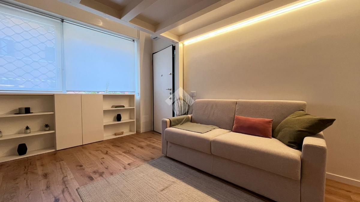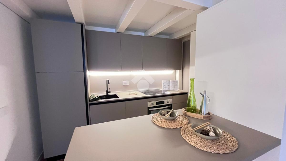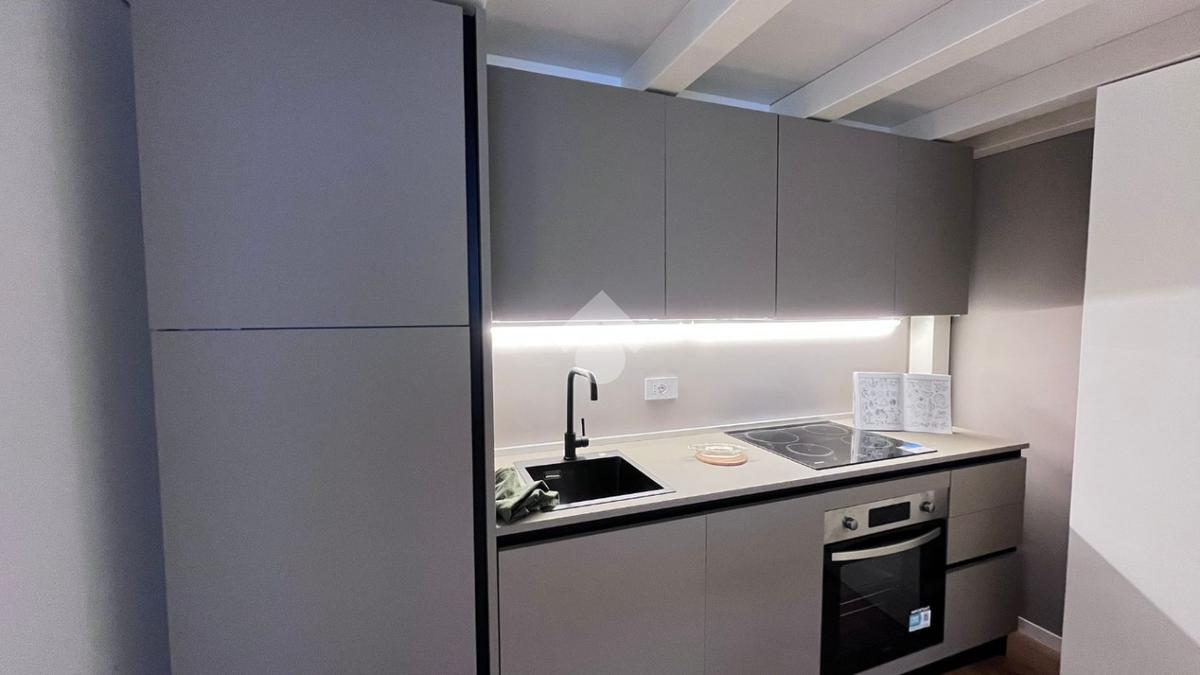 L’ingresso si apre su una luminosa zona giorno open space, illuminata da un’ampia vetrata, a cui si affianca una cucina semi-abitabile, moderna e completamente attrezzata. Il bagno è dotato di una doccia, mentre il soppalco ospita una pratica cabina armadio.