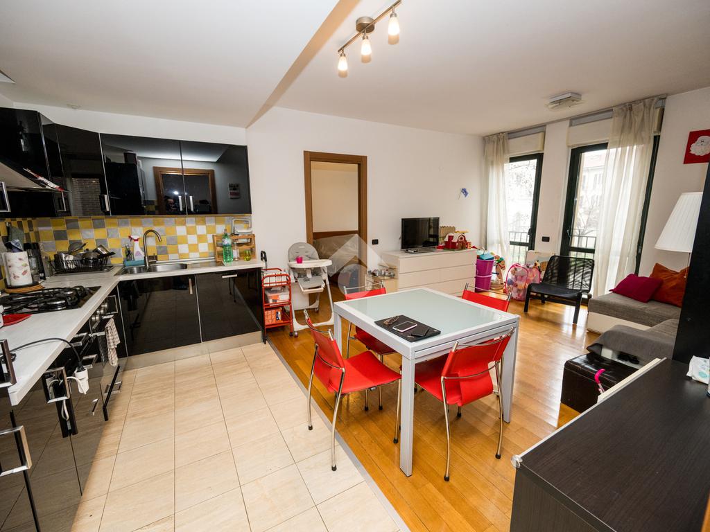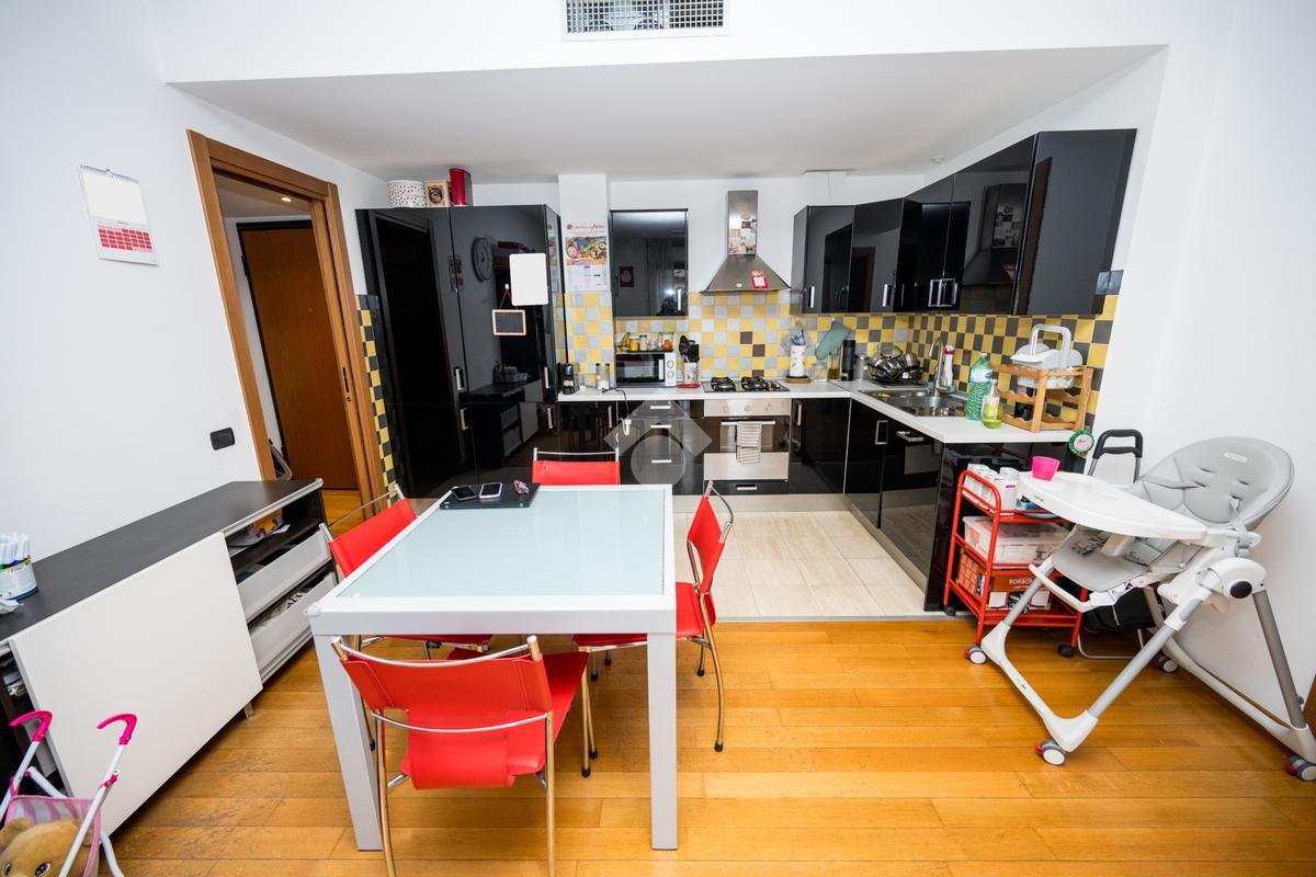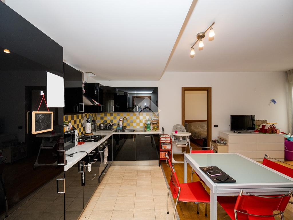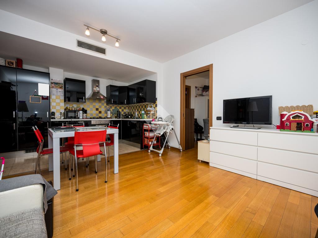 L'appartamento è composto da ingresso su disimpegno, soggiorno con cucina a vista, camera da letto matrimoniale con cabina armadio e bagno con vasca e box doccia.