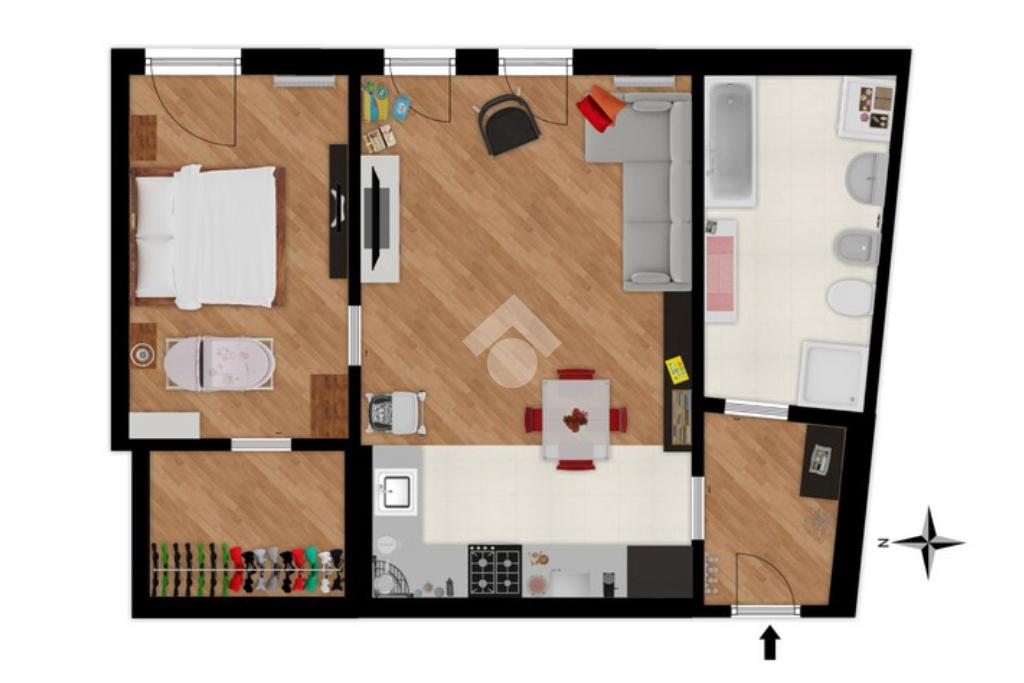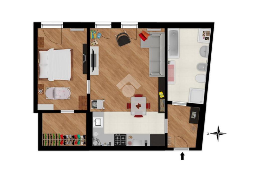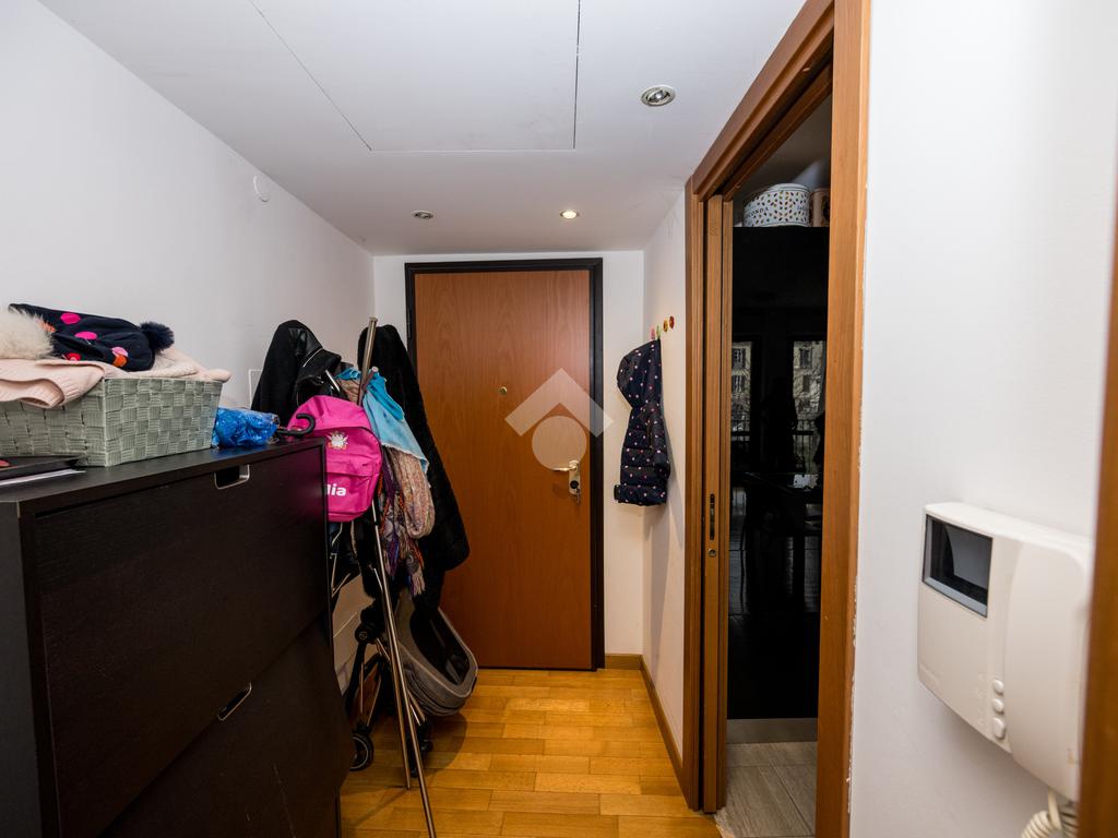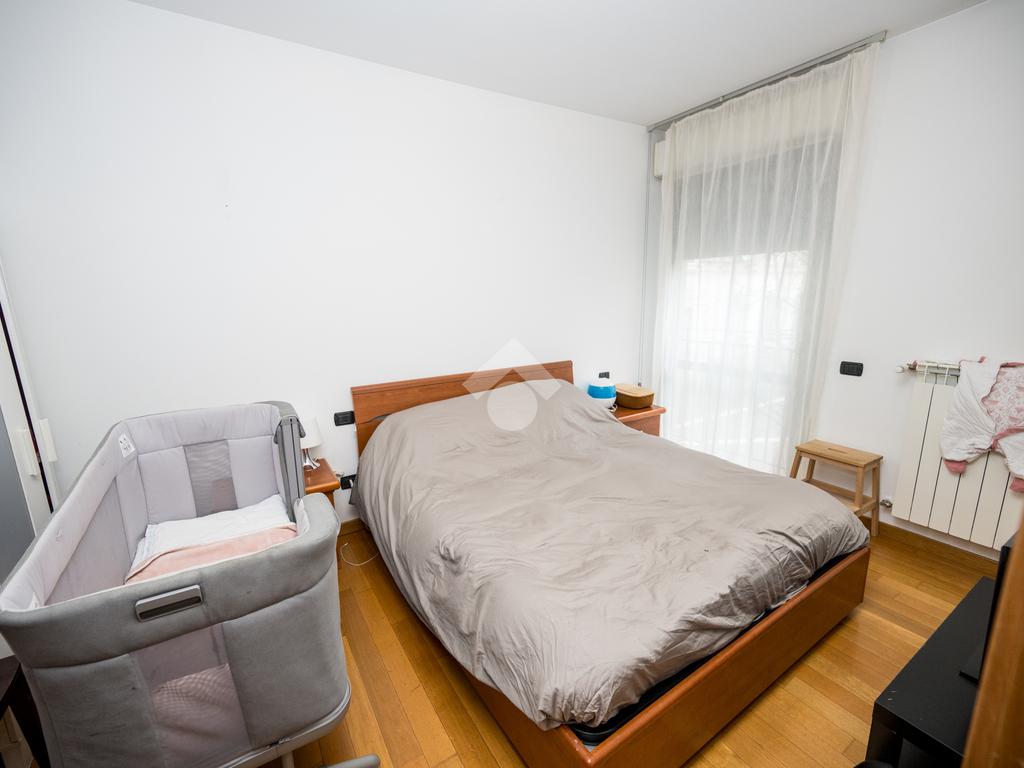 L'appartamento è composto da ingresso su disimpegno, soggiorno con cucina a vista, camera da letto matrimoniale con cabina armadio e bagno con vasca e box doccia.