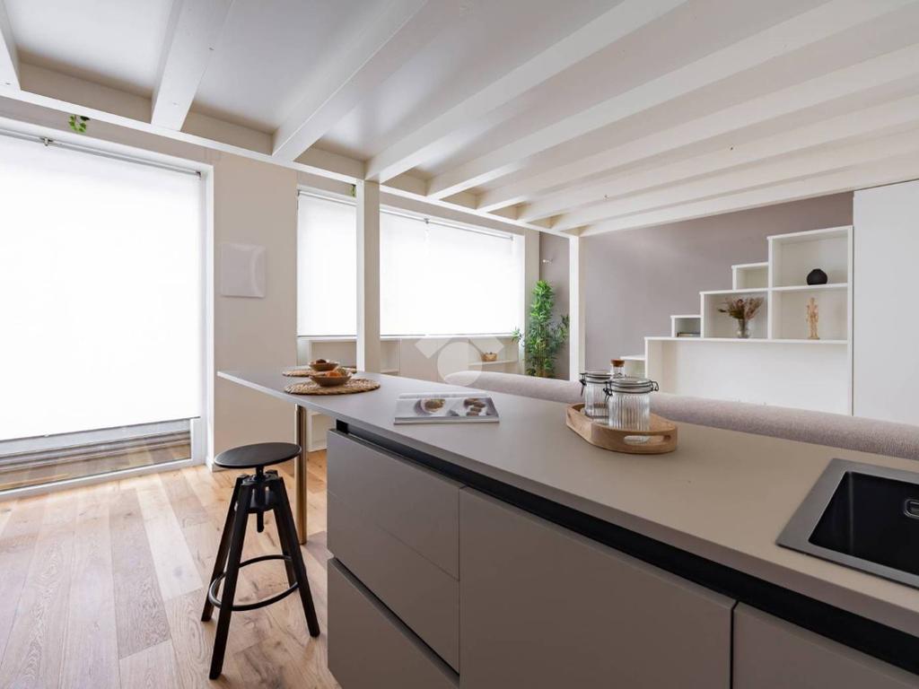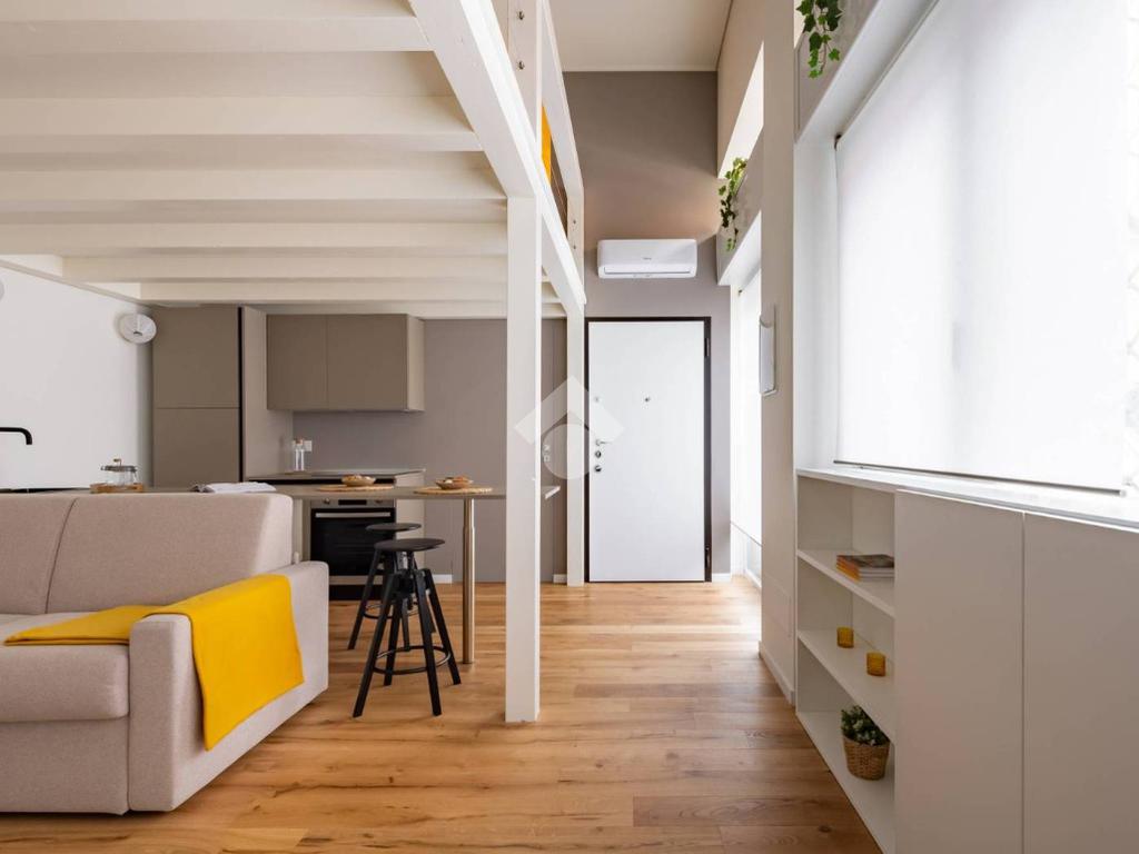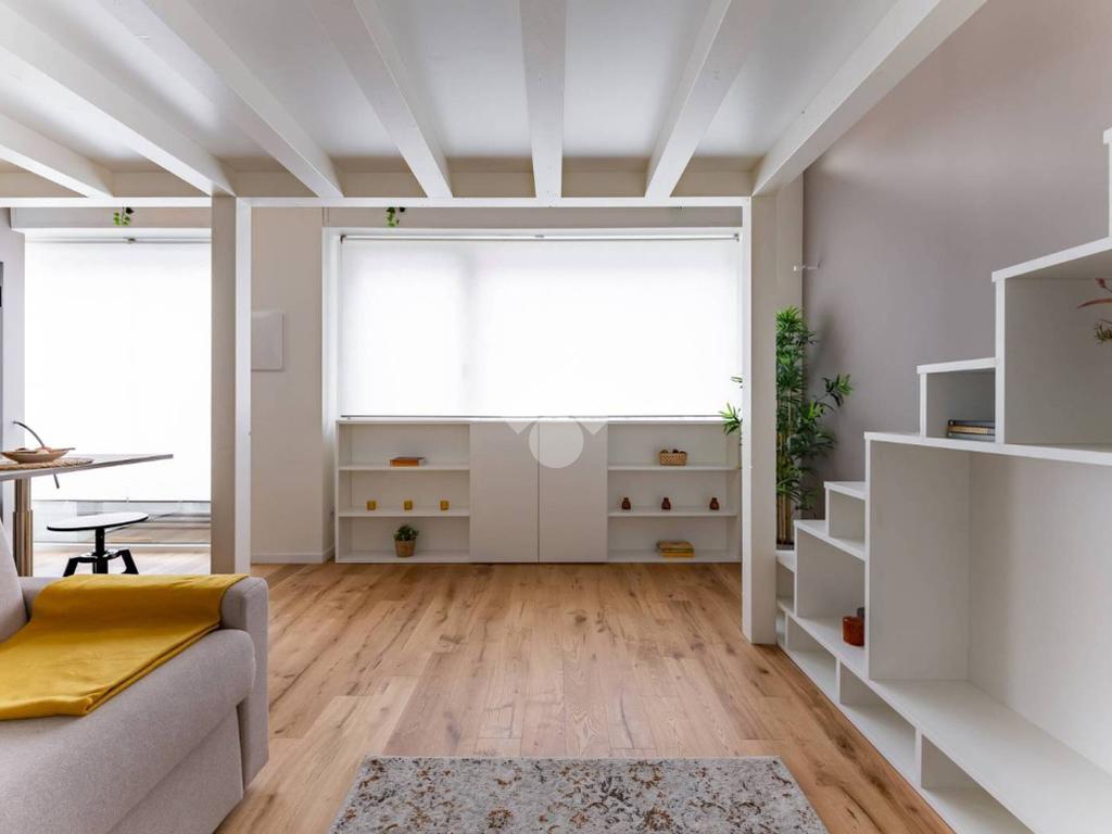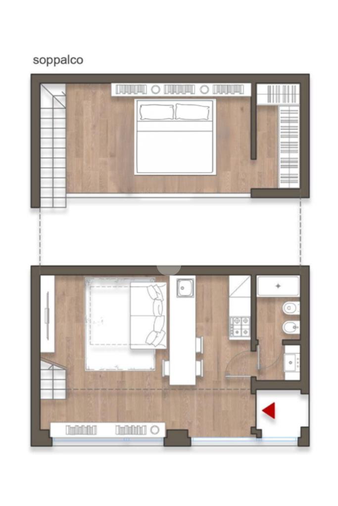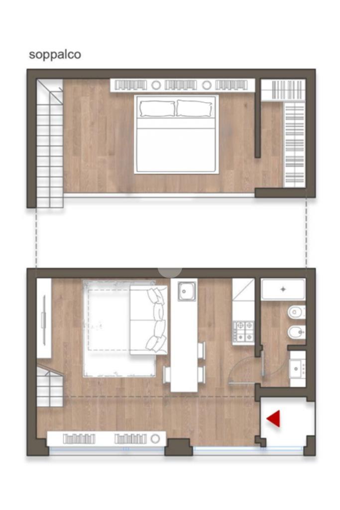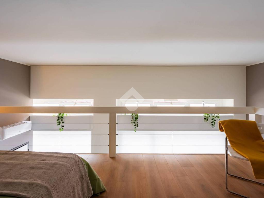 L’ingresso si apre su una luminosa zona giorno open space, illuminata da un’ampia vetrata, a cui si affianca una cucina semi-abitabile, moderna e completamente attrezzata. Il bagno è dotato di una doccia, mentre il soppalco ospita una pratica cabina armadio.