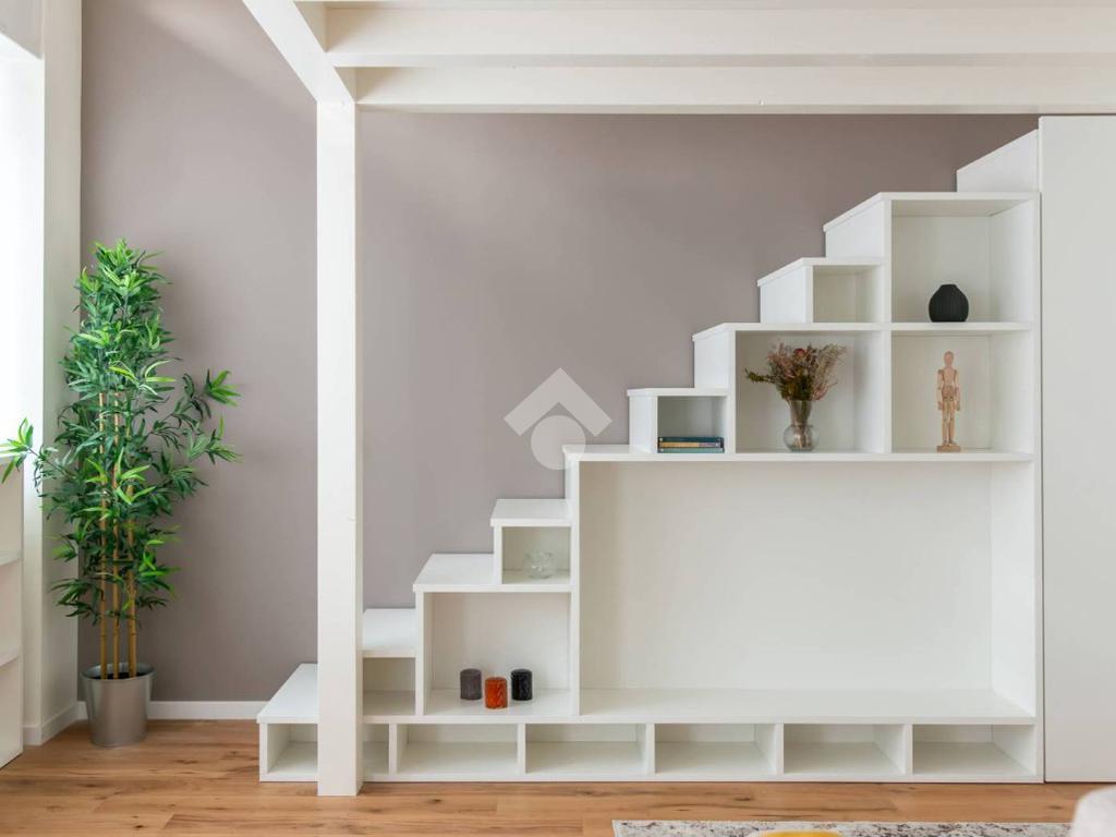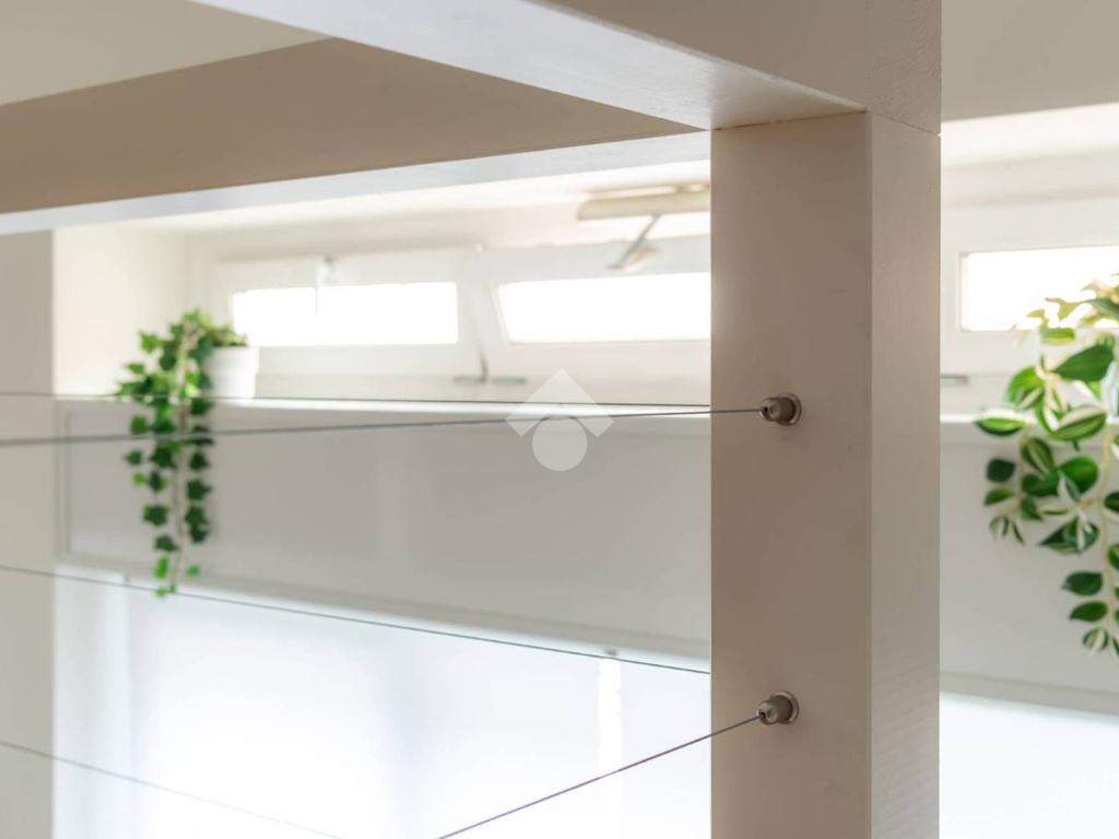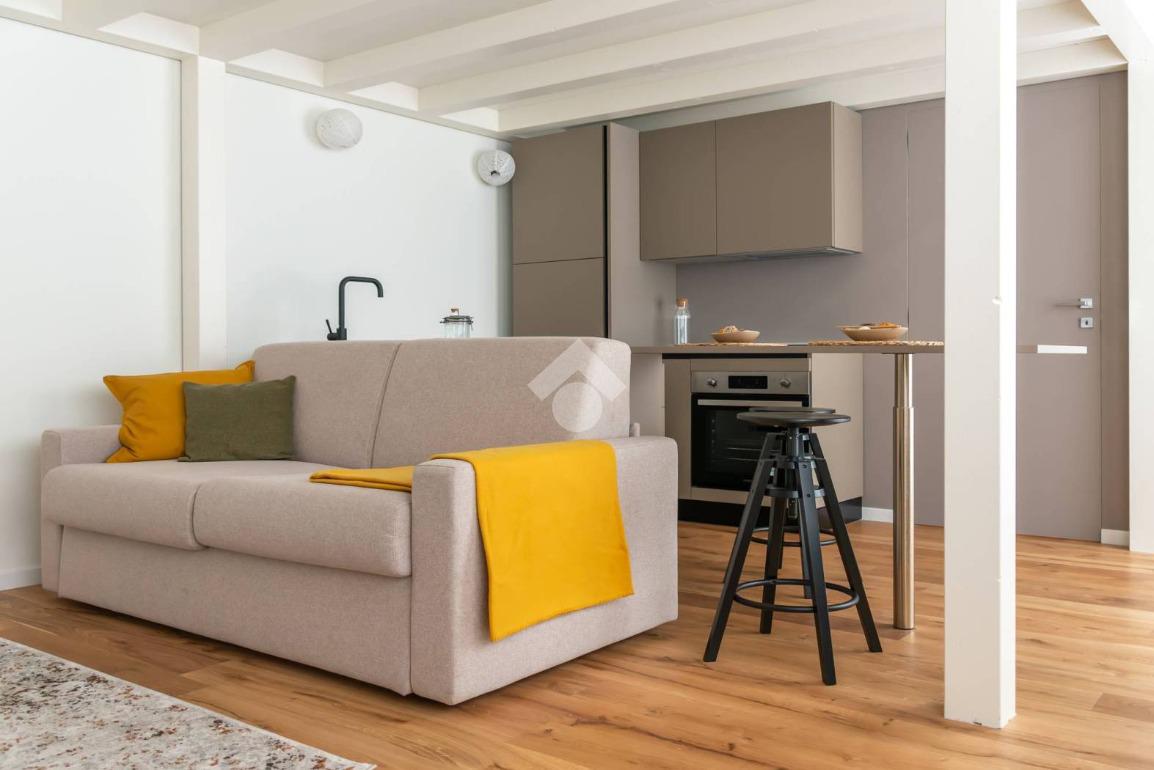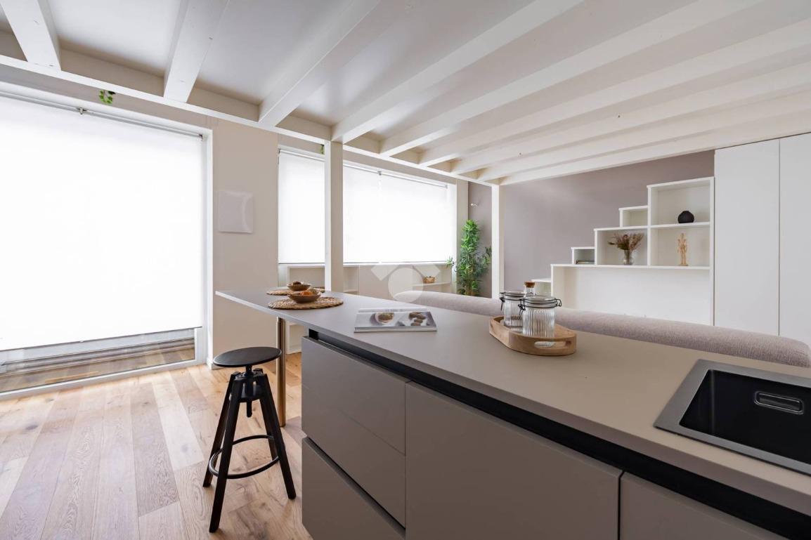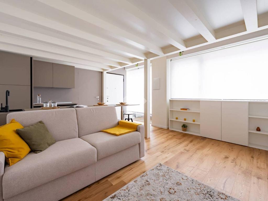 L’ingresso si apre su una luminosa zona giorno open space, illuminata da un’ampia vetrata, a cui si affianca una cucina semi-abitabile, moderna e completamente attrezzata. Il bagno è dotato di una doccia, mentre il soppalco ospita una pratica cabina armadio.