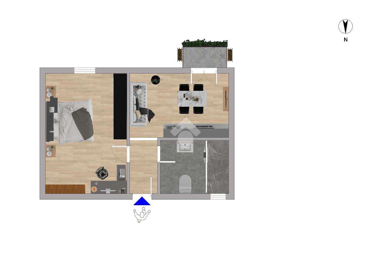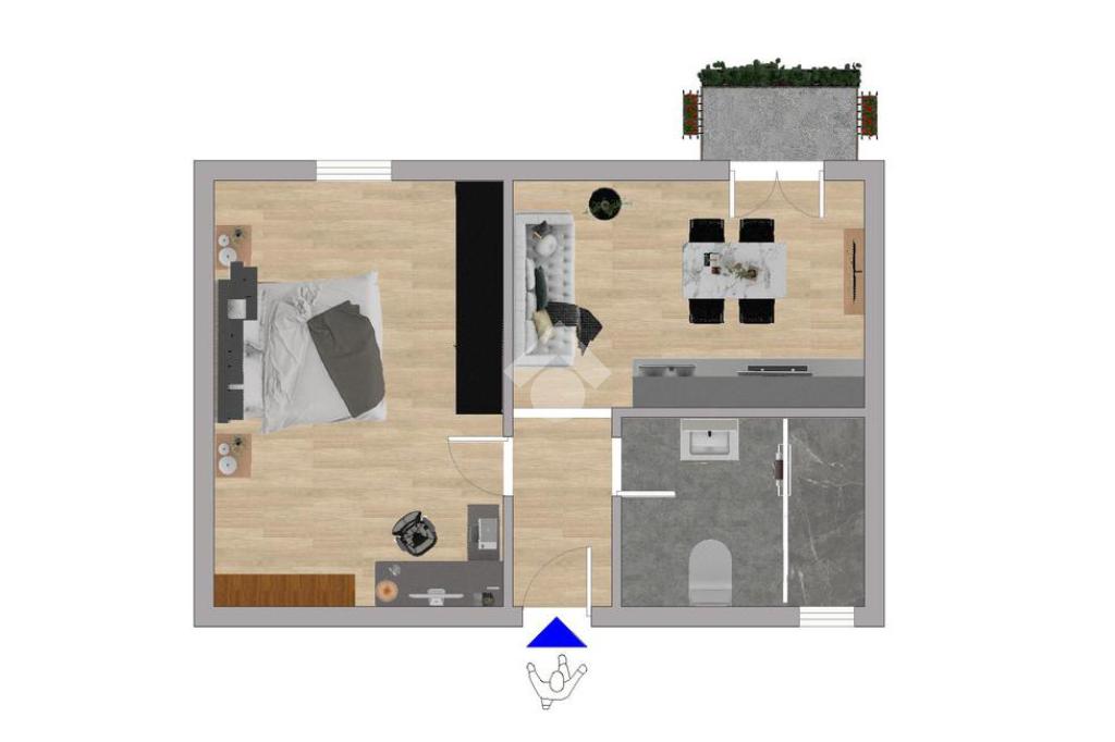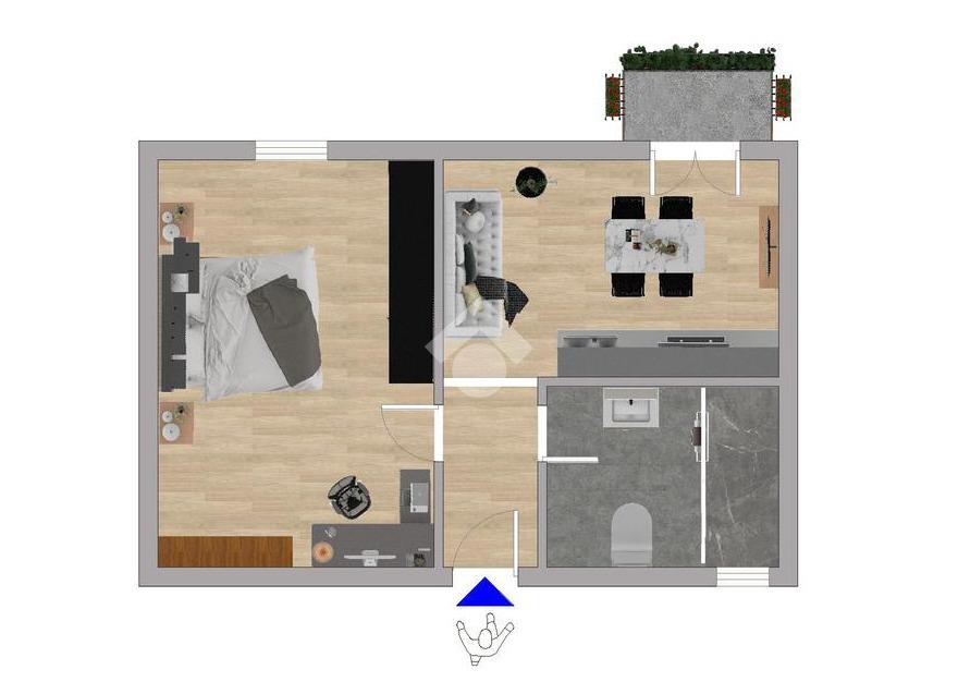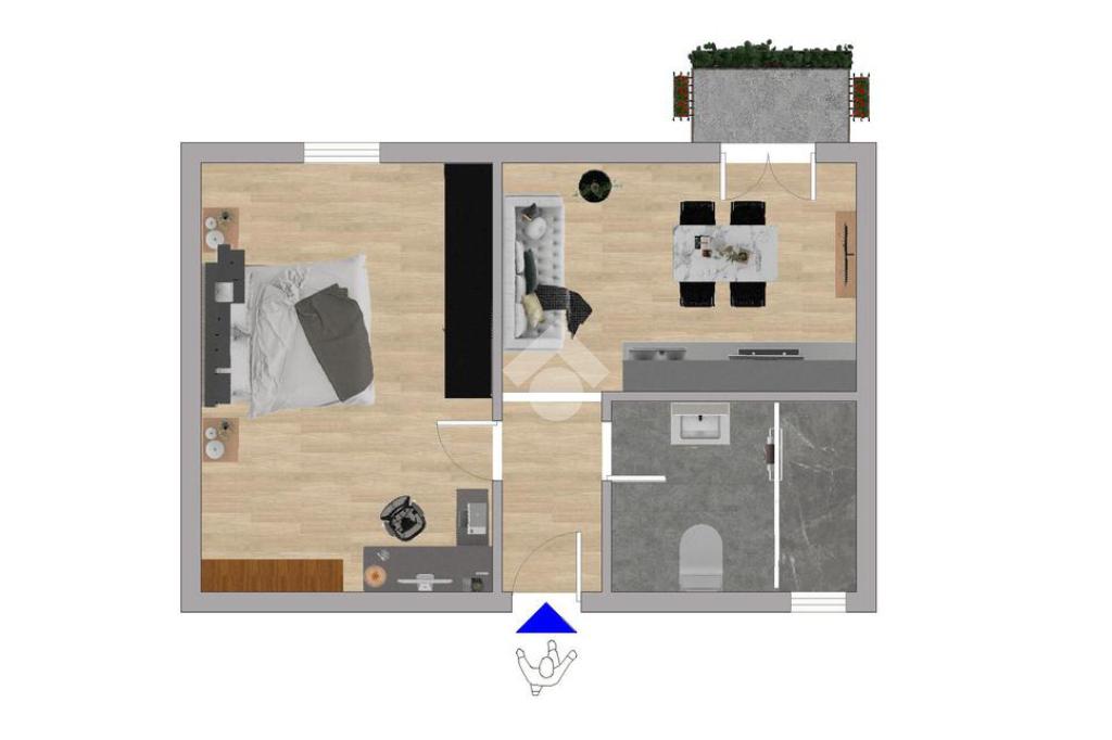 L’immobile si apre su un ingresso con corridoio che conduce alla cucina con accesso al balcone. Sulla destra dell’ingresso si trova il bagno finestrato con doccia, mentre sulla sinistra è presente un’ampia camera matrimoniale, luminosa e facilmente personalizzabile.